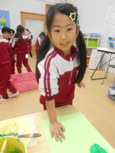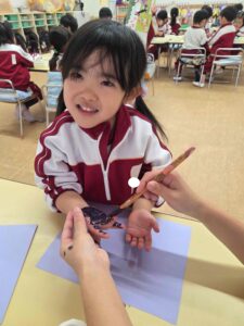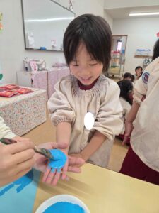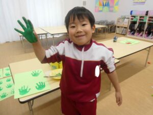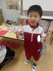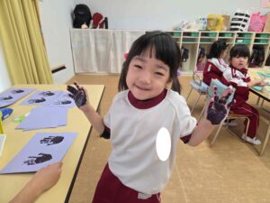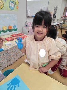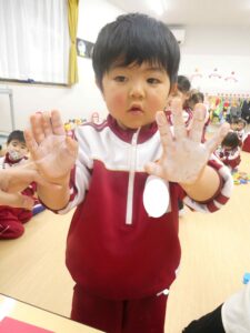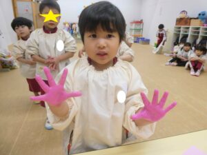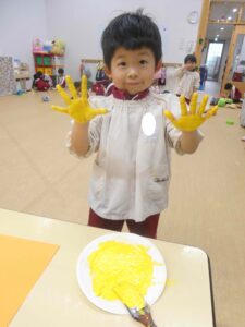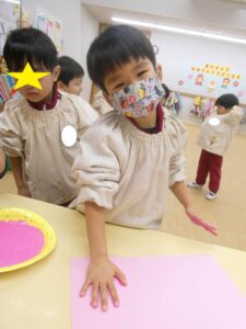 各保育室では、絵の具を手に付けて手形をとる子ども達。