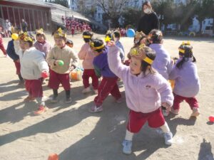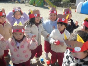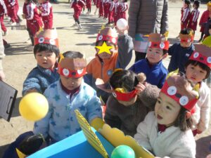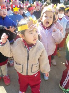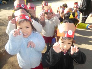 自分で作った鬼のお面を付けて、鬼退治をしました♪