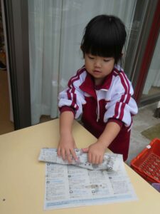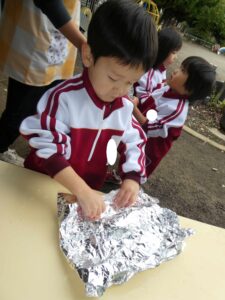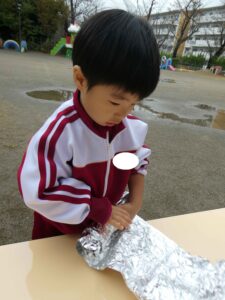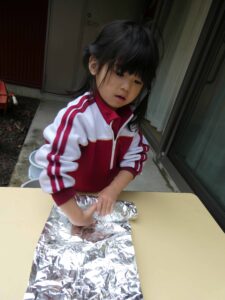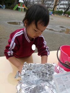 前日に年長組さんが洗ってくれたお芋を、新聞紙やアルミホイルで巻き巻きしたら、準備は完了♪