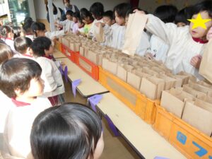 衣装を身にまとい、バッグを持って、折り紙などで作った手作りお菓子を持っている先生たちを探す子ども達。