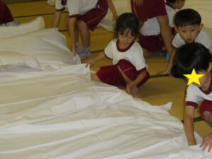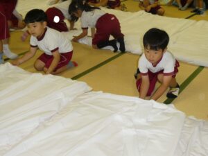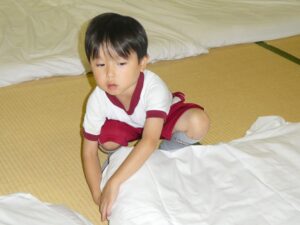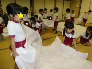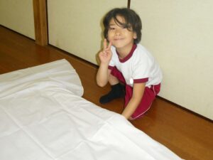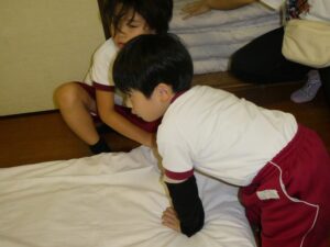 シーツはお布団の下に折り込んで…と、みんなで協力しながら頑張っていました(*^^*)