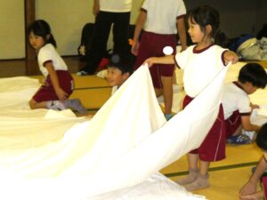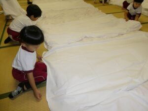 広い部屋にみんなでお布団を運び敷き詰めて、順番にシーツをかけていきます。