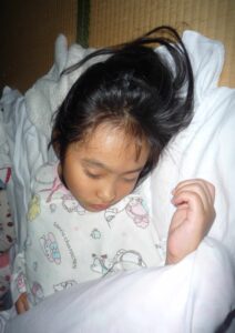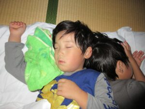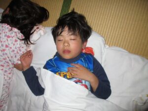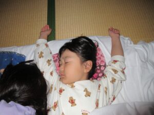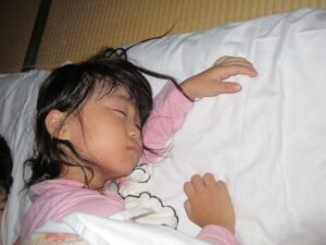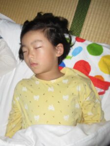 お部屋に戻って髪の毛を乾かし、歯磨きも終わり、就寝の時間です。