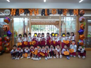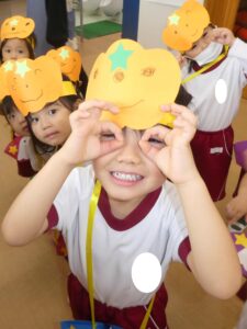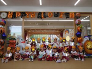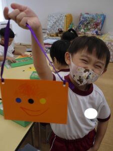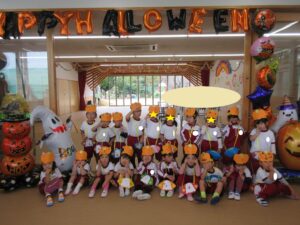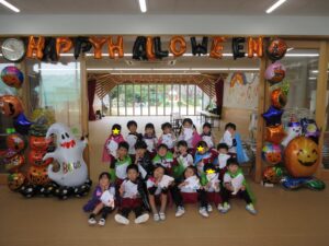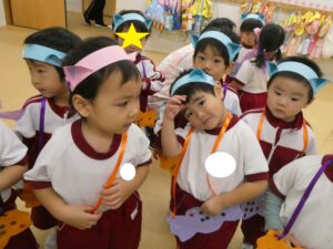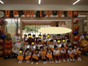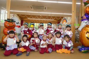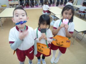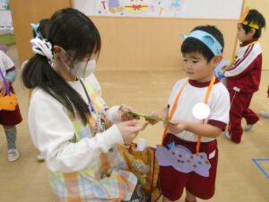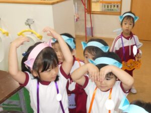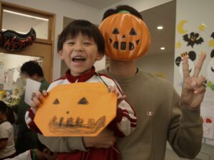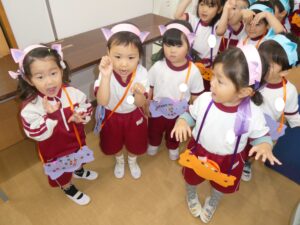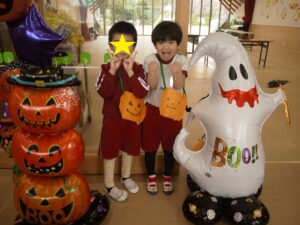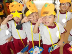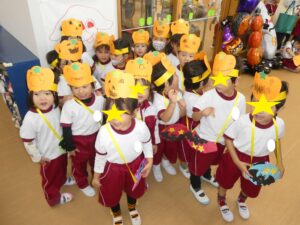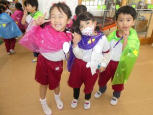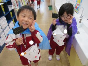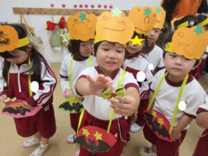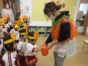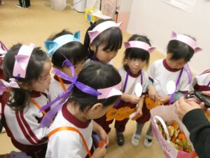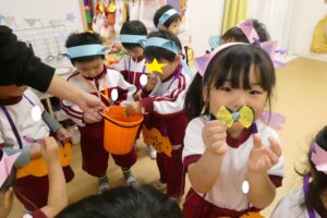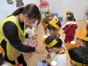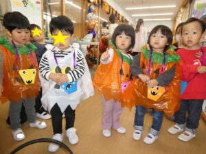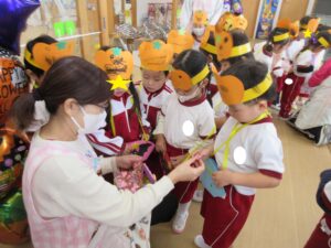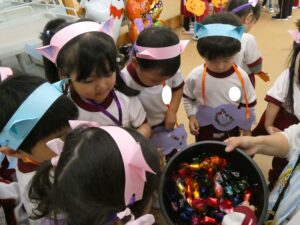 衣装を身にまとい、バッグを持って、折り紙などで作った手作りお菓子を持っている先生たちを探す子ども達。