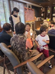 引いたくじの絵と同じ折り紙を持っている、おじいちゃんおばあちゃんを探してお菓子をゲット!(^^)!